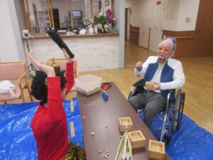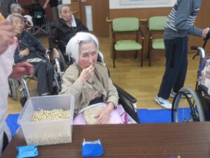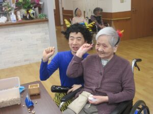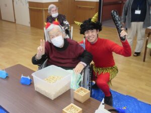 豆まきは皆様懐かしいと話しながら笑顔で参加していただけました。スタッフが鬼の恰好をして