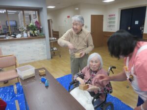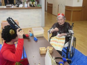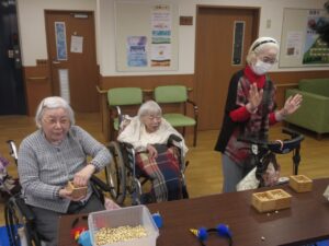 豆まきは皆様懐かしいと話しながら笑顔で参加していただけました。スタッフが鬼の恰好をして